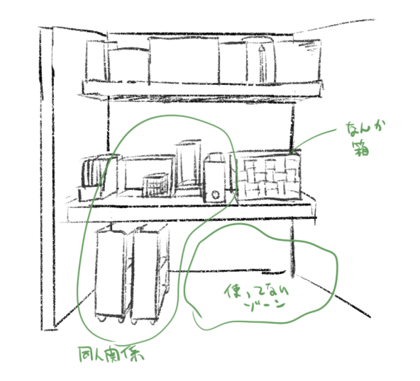 下にはデカいキャリーバッグと季節家電の箱と…開かずの箱。